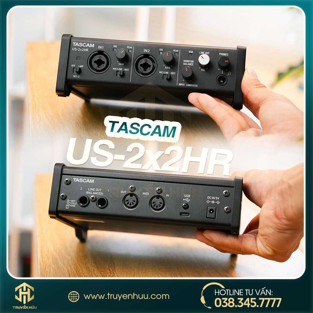 Đi kèm là soundcard Tascam US-2x2HR, audio interface chuẩn 24-bit / 192 kHz được trang bị Ultra-HDDA mic preamp, nổi tiếng với khả năng khuếch đại tín hiệu sạch, ít nhiễu và giữ được độ chi tiết của micro. Thiết bị cũng cung cấp phantom 48V để cấp nguồn cho micro condenser và có độ trễ thấp khi thu âm hoặc livestream.