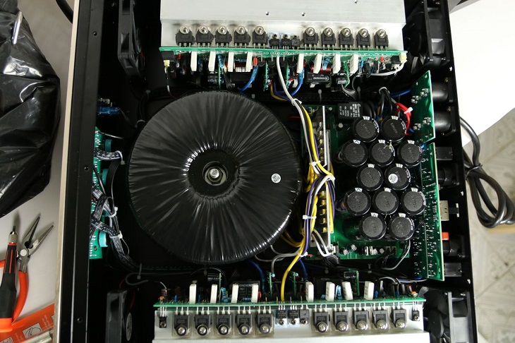 Thân máy bao gồm các linh kiện, phụ kiện điện tử và các bo mạch nhỏ, đây cũng là phần quyết định chất lượng của cục đẩy công suất.