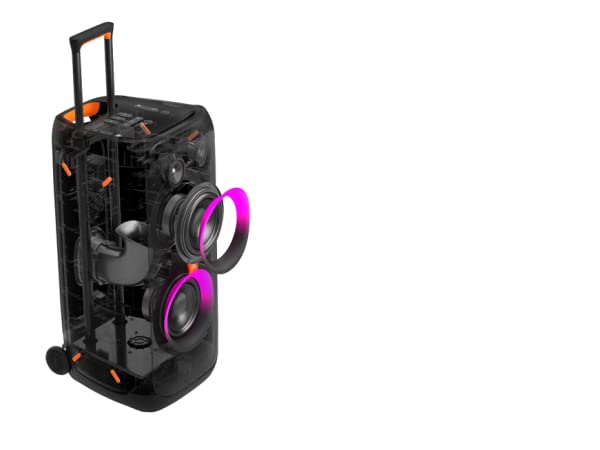 - Âm thanh mạnh mẽ mang thương hiệu JBL với âm trầm sâu, tối ưu hóa tiếng hát được tái hiện rõ ràng hơn so với phiên bản partybox 300 cũ.