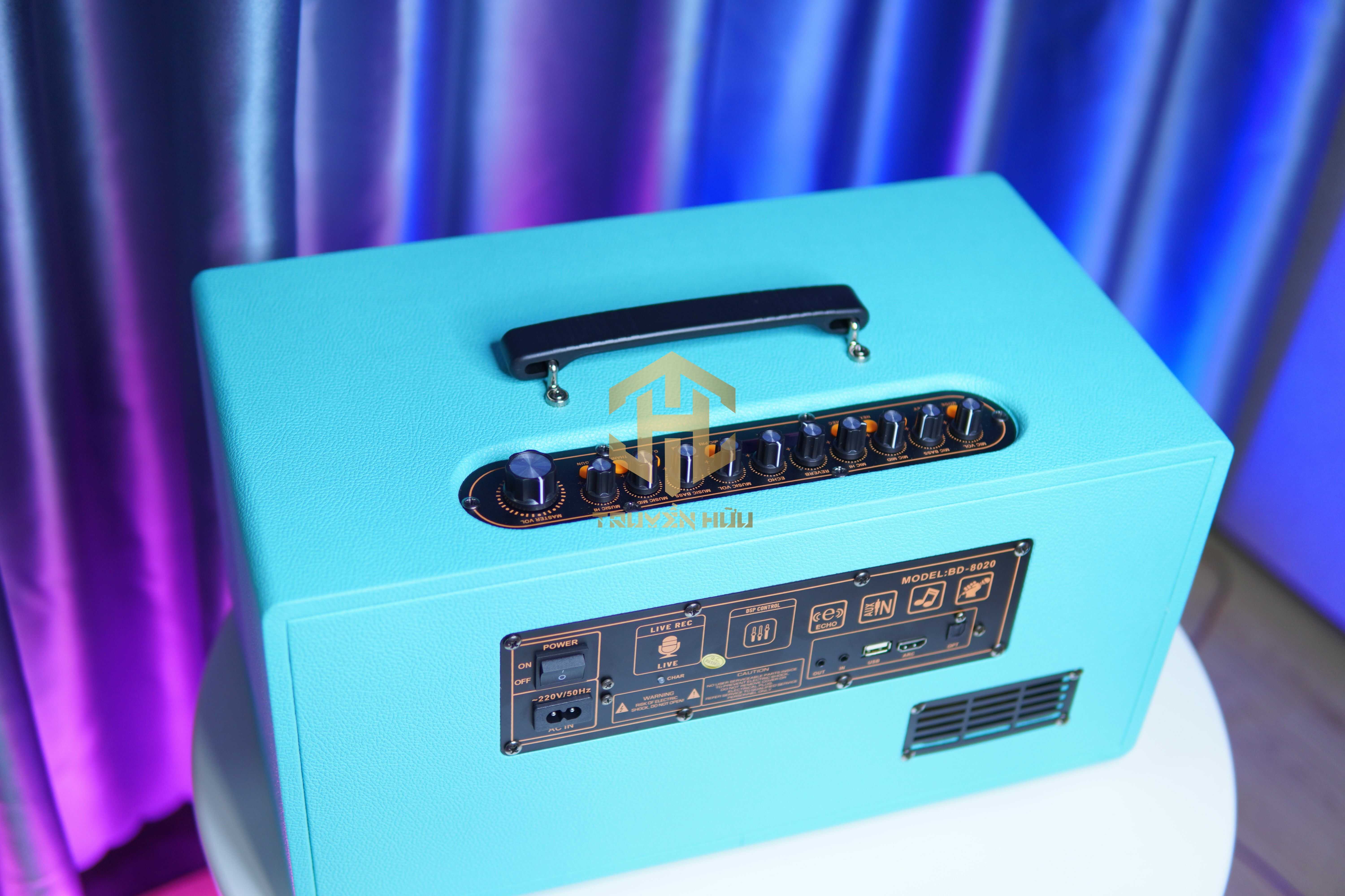 Bên trên là hệ thống bảng điều khiển có quai xách tiện lợi, mặt sau của loa gồm nhiều loại cổng kết nối tiện lợi. Best Sound M6 đi kèm với 2 micro không dây UHF bằng nhôm chắc chắn.