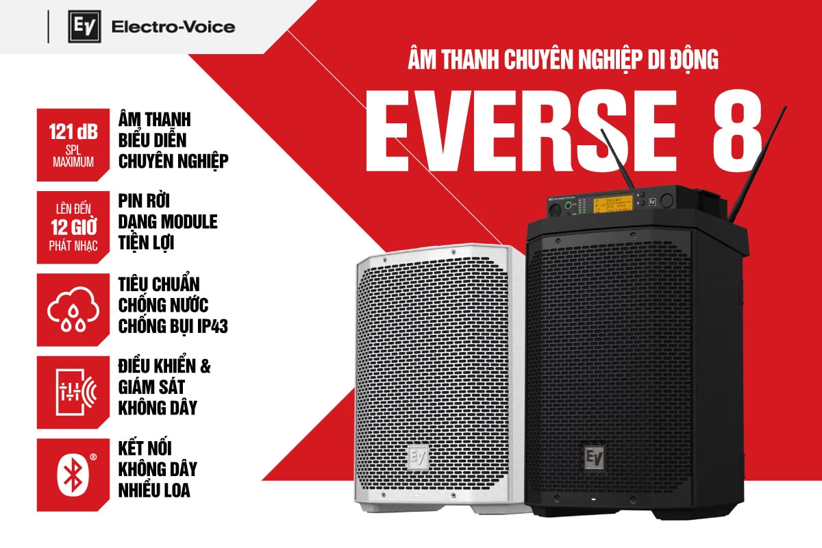 Với hơn 90 năm kinh nghiệm, Electro Voice đã đặt rất nhiều cải tiến và tham vọng vào Everse 8, biến nó trở thành một trong những loa PA nhỏ có nhiều tính năng và ấn tượng nhất trên thị trường. Loa Electro Voice Everse 8 là mẫu loa karaoke chạy bằng pin đầu tiên của thương hiệu Electro Voice có tích hợp bluetooth.