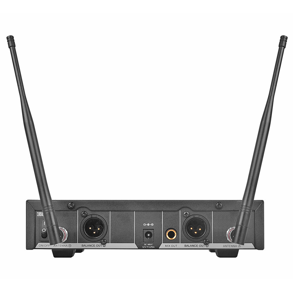 Ở mặt sau của đầu thu chính là các cổng kết nối và có 2 ăng ten có nhiệm vụ bắt sóng tốt hơn. Phần tay cầm micro cũng được thiết kế chế tạo từ hợp kim cao cấp. Chính giữa của micro là nút công tắc bật/tắt và một màn hình nhỏ hiển thị các thông số của micro đó cũng như tình trạng pin.