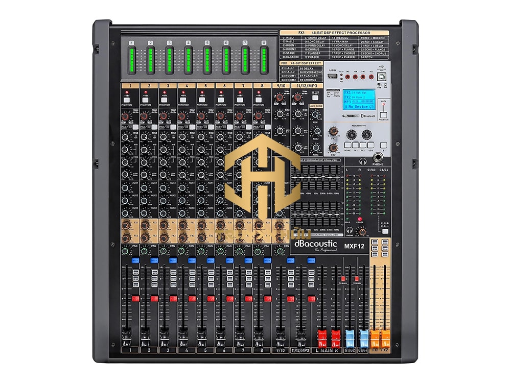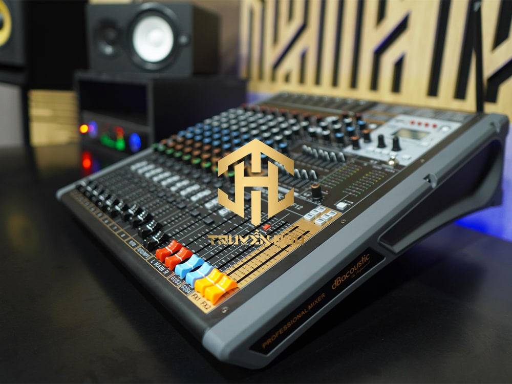 - Mixer dBacoustic MFX12 là một trong những chiếc mixer chuyên nghiệp, tích hợp nhiều công nghệ hiện đại để đem lại hiệu ứng âm thanh tốt nhất, thiết kế thân thiện với người dùng. Sản phẩm được lựa chọn sử dụng nhiều cho hệ thống âm thanh chuyên nghiệp, âm thanh sân khấu hội trường, những không gian âm thanh phòng hát cao cấp, có diện tích rộng.