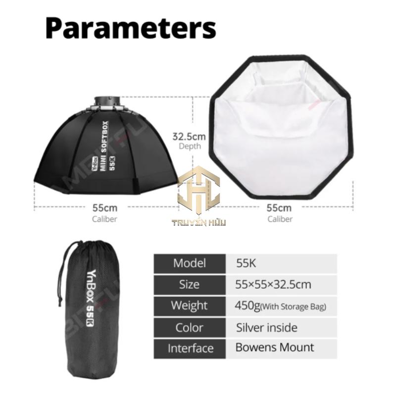 Tác dụng chính và quan trọng nhất của Softbox là gom sáng và kết hợp với lớp vải lọc bên ngoài sẽ làm dịu ánh sáng và làm các tia sáng chiếu tới người mẫu chuẩn và đẹp nhất. Softbox Yongnuo Ynbox YN55K phù hợp với những phòng có diện tích tương đối vừa phải và cần độ sâu của ánh sáng để Focus vào chủ thể được rõ hơn.